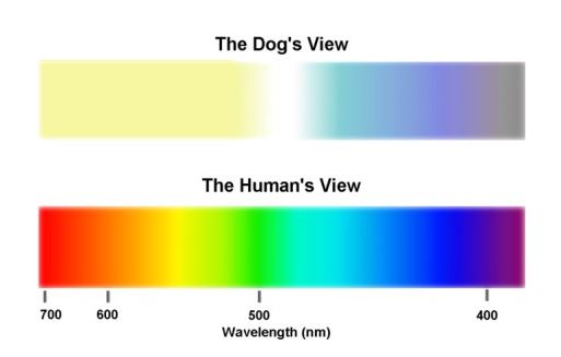 다양한 색깔을 구분하는 우리와 달리 강아지는 사람과 같은 것을 보더라도 색깔자체가 다르게 보입니다. 볼 수 있는 색깔자체가 다양하지 않습니다. 그래서 강아지가 보는 세상은 우리와 다른데요, 우리 반려견들은 노란색, 파란색은 구별하고 녹색과 빨간색은 구별하지 못합니다.